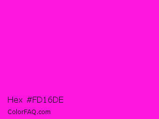 Hex #fd16de Color is a normal magenta color and the nearest color is Hot Magenta #ff1dce. Hex code #fd16de and RGB value is rgb(253,22,222). In RGB color space, this color is composed of 99% red, 9% green, 87% blue, In CMYK color space, this color is composed of 0% cyan, 91% magenta, 12% yellow , 1% black , In HSL color space, this color has a hue angle of 308° , 98% saturation and 54% lightness.