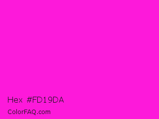 Hex #fd19da Color is a normal magenta color and the nearest color is Hot Magenta #ff1dce. Hex code #fd19da and RGB value is rgb(253,25,218). In RGB color space, this color is composed of 99% red, 10% green, 85% blue, In CMYK color space, this color is composed of 0% cyan, 90% magenta, 14% yellow , 1% black , In HSL color space, this color has a hue angle of 309° , 98% saturation and 55% lightness.