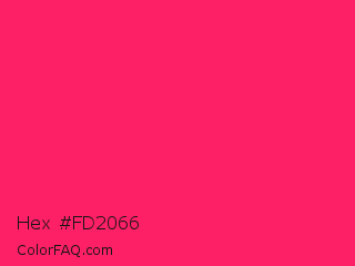 Hex #fd2066 Color is a normal rose color and the nearest color is Awesome #ff2052. Hex code #fd2066 and RGB value is rgb(253,32,102). In RGB color space, this color is composed of 99% red, 13% green, 40% blue, In CMYK color space, this color is composed of 0% cyan, 87% magenta, 60% yellow , 1% black , In HSL color space, this color has a hue angle of 341° , 98% saturation and 56% lightness.
