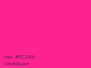 Hex #fd2491 Color is a normal rose color and the nearest color is Fluorescent Pink #ff1493. Hex code #fd2491 and RGB value is rgb(253,36,145). In RGB color space, this color is composed of 99% red, 14% green, 57% blue, In CMYK color space, this color is composed of 0% cyan, 86% magenta, 43% yellow , 1% black , In HSL color space, this color has a hue angle of 330° , 98% saturation and 57% lightness.