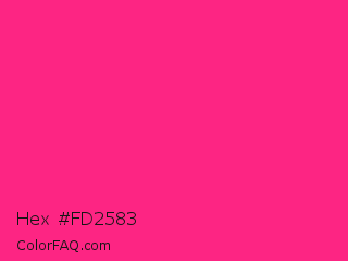 Hex #fd2583 Color is a normal rose color and the nearest color is Fluorescent Pink #ff1493. Hex code #fd2583 and RGB value is rgb(253,37,131). In RGB color space, this color is composed of 99% red, 15% green, 51% blue, In CMYK color space, this color is composed of 0% cyan, 85% magenta, 48% yellow , 1% black , In HSL color space, this color has a hue angle of 334° , 98% saturation and 57% lightness.