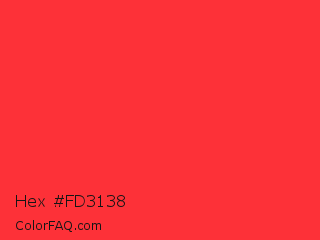 Hex #fd3138 Color is a normal red color and the nearest color is Deep Carmine Pink #ef3038. Hex code #fd3138 and RGB value is rgb(253,49,56). In RGB color space, this color is composed of 99% red, 19% green, 22% blue, In CMYK color space, this color is composed of 0% cyan, 81% magenta, 78% yellow , 1% black , In HSL color space, this color has a hue angle of 358° , 98% saturation and 59% lightness.