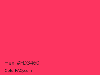 Hex #fd3460 Color is a normal red color and the nearest color is Radical Red #ff355e. Hex code #fd3460 and RGB value is rgb(253,52,96). In RGB color space, this color is composed of 99% red, 20% green, 38% blue, In CMYK color space, this color is composed of 0% cyan, 79% magenta, 62% yellow , 1% black , In HSL color space, this color has a hue angle of 347° , 98% saturation and 60% lightness.