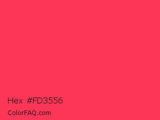 Hex #fd3556 Color is a normal red color and the nearest color is Sizzling Red #ff3855. Hex code #fd3556 and RGB value is rgb(253,53,86). In RGB color space, this color is composed of 99% red, 21% green, 34% blue, In CMYK color space, this color is composed of 0% cyan, 79% magenta, 66% yellow , 1% black , In HSL color space, this color has a hue angle of 350° , 98% saturation and 60% lightness.