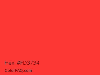 Hex #fd3734 Color is a normal red color and the nearest color is Red Orange #ff3f34. Hex code #fd3734 and RGB value is rgb(253,55,52). In RGB color space, this color is composed of 99% red, 22% green, 20% blue, In CMYK color space, this color is composed of 0% cyan, 78% magenta, 79% yellow , 1% black , In HSL color space, this color has a hue angle of 1° , 98% saturation and 60% lightness.