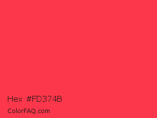 Hex #fd374b Color is a normal red color and the nearest color is Red Salsa #fd3a4a. Hex code #fd374b and RGB value is rgb(253,55,75). In RGB color space, this color is composed of 99% red, 22% green, 29% blue, In CMYK color space, this color is composed of 0% cyan, 78% magenta, 70% yellow , 1% black , In HSL color space, this color has a hue angle of 354° , 98% saturation and 60% lightness.
