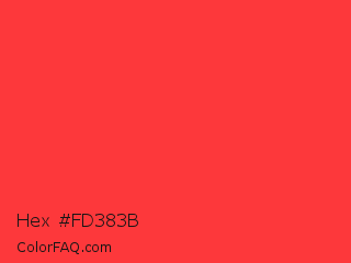 Hex #fd383b Color is a light red color and the nearest color is Coral Red #ff4040. Hex code #fd383b and RGB value is rgb(253,56,59). In RGB color space, this color is composed of 99% red, 22% green, 23% blue, In CMYK color space, this color is composed of 0% cyan, 78% magenta, 77% yellow , 1% black , In HSL color space, this color has a hue angle of 359° , 98% saturation and 61% lightness.