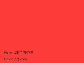 Hex #fd3b38 Color is a light red color and the nearest color is Red Orange #ff3f34. Hex code #fd3b38 and RGB value is rgb(253,59,56). In RGB color space, this color is composed of 99% red, 23% green, 22% blue, In CMYK color space, this color is composed of 0% cyan, 77% magenta, 78% yellow , 1% black , In HSL color space, this color has a hue angle of 1° , 98% saturation and 61% lightness.