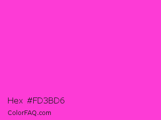 Hex #fd3bd6 Color is a light magenta color and the nearest color is Razzle Dazzle Rose #ff33cc. Hex code #fd3bd6 and RGB value is rgb(253,59,214). In RGB color space, this color is composed of 99% red, 23% green, 84% blue, In CMYK color space, this color is composed of 0% cyan, 77% magenta, 15% yellow , 1% black , In HSL color space, this color has a hue angle of 312° , 98% saturation and 61% lightness.