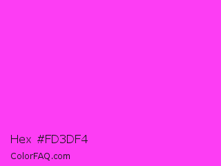Hex #fd3df4 Color is a light magenta color and the nearest color is Purple Pizzazz #fe4eda. Hex code #fd3df4 and RGB value is rgb(253,61,244). In RGB color space, this color is composed of 99% red, 24% green, 96% blue, In CMYK color space, this color is composed of 0% cyan, 76% magenta, 4% yellow , 1% black , In HSL color space, this color has a hue angle of 303° , 98% saturation and 62% lightness.