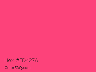 Hex #fd427a Color is a light rose color and the nearest color is Sasquatch Socks #ff4681. Hex code #fd427a and RGB value is rgb(253,66,122). In RGB color space, this color is composed of 99% red, 26% green, 48% blue, In CMYK color space, this color is composed of 0% cyan, 74% magenta, 52% yellow , 1% black , In HSL color space, this color has a hue angle of 342° , 98% saturation and 63% lightness.