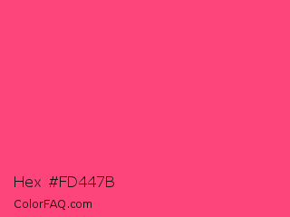 Hex #fd447b Color is a light rose color and the nearest color is Sasquatch Socks #ff4681. Hex code #fd447b and RGB value is rgb(253,68,123). In RGB color space, this color is composed of 99% red, 27% green, 48% blue, In CMYK color space, this color is composed of 0% cyan, 73% magenta, 51% yellow , 1% black , In HSL color space, this color has a hue angle of 342° , 98% saturation and 63% lightness.