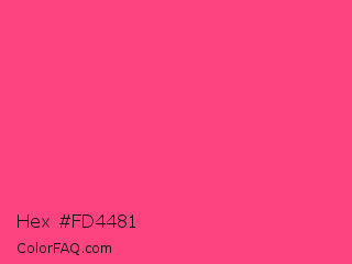Hex #fd4481 Color is a light rose color and the nearest color is Sasquatch Socks #ff4681. Hex code #fd4481 and RGB value is rgb(253,68,129). In RGB color space, this color is composed of 99% red, 27% green, 51% blue, In CMYK color space, this color is composed of 0% cyan, 73% magenta, 49% yellow , 1% black , In HSL color space, this color has a hue angle of 340° , 98% saturation and 63% lightness.