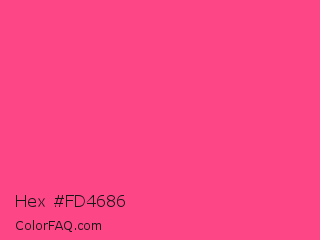 Hex #fd4686 Color is a light rose color and the nearest color is Sasquatch Socks #ff4681. Hex code #fd4686 and RGB value is rgb(253,70,134). In RGB color space, this color is composed of 99% red, 27% green, 53% blue, In CMYK color space, this color is composed of 0% cyan, 72% magenta, 47% yellow , 1% black , In HSL color space, this color has a hue angle of 339° , 98% saturation and 63% lightness.