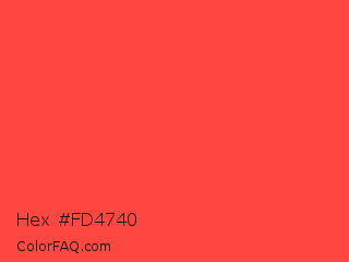 Hex #fd4740 Color is a light red color and the nearest color is Sunset Orange #fe4c40. Hex code #fd4740 and RGB value is rgb(253,71,64). In RGB color space, this color is composed of 99% red, 28% green, 25% blue, In CMYK color space, this color is composed of 0% cyan, 72% magenta, 75% yellow , 1% black , In HSL color space, this color has a hue angle of 2° , 98% saturation and 62% lightness.