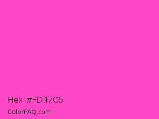 Hex #fd47c6 Color is a light magenta color and the nearest color is Razzle Dazzle Rose #ff33cc. Hex code #fd47c6 and RGB value is rgb(253,71,198). In RGB color space, this color is composed of 99% red, 28% green, 78% blue, In CMYK color space, this color is composed of 0% cyan, 72% magenta, 22% yellow , 1% black , In HSL color space, this color has a hue angle of 318° , 98% saturation and 64% lightness.