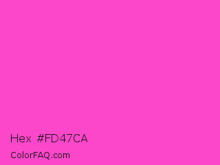 Hex #fd47ca Color is a light magenta color and the nearest color is Purple Pizzazz #fe4eda. Hex code #fd47ca and RGB value is rgb(253,71,202). In RGB color space, this color is composed of 99% red, 28% green, 79% blue, In CMYK color space, this color is composed of 0% cyan, 72% magenta, 20% yellow , 1% black , In HSL color space, this color has a hue angle of 317° , 98% saturation and 64% lightness.