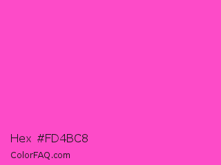 Hex #fd4bc8 Color is a light magenta color and the nearest color is Light Deep Pink #ff5ccd. Hex code #fd4bc8 and RGB value is rgb(253,75,200). In RGB color space, this color is composed of 99% red, 29% green, 78% blue, In CMYK color space, this color is composed of 0% cyan, 70% magenta, 21% yellow , 1% black , In HSL color space, this color has a hue angle of 318° , 98% saturation and 64% lightness.