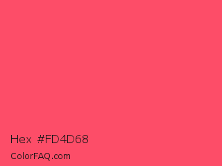 Hex #fd4d68 Color is a light red color and the nearest color is Infra Red #ff496c. Hex code #fd4d68 and RGB value is rgb(253,77,104). In RGB color space, this color is composed of 99% red, 30% green, 41% blue, In CMYK color space, this color is composed of 0% cyan, 70% magenta, 59% yellow , 1% black , In HSL color space, this color has a hue angle of 351° , 98% saturation and 65% lightness.