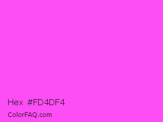 Hex #fd4df4 Color is a light magenta color and the nearest color is Purple Pizzazz #fe4eda. Hex code #fd4df4 and RGB value is rgb(253,77,244). In RGB color space, this color is composed of 99% red, 30% green, 96% blue, In CMYK color space, this color is composed of 0% cyan, 70% magenta, 4% yellow , 1% black , In HSL color space, this color has a hue angle of 303° , 98% saturation and 65% lightness.