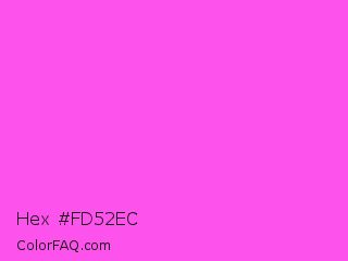 Hex #fd52ec Color is a light magenta color and the nearest color is Purple Pizzazz #fe4eda. Hex code #fd52ec and RGB value is rgb(253,82,236). In RGB color space, this color is composed of 99% red, 32% green, 93% blue, In CMYK color space, this color is composed of 0% cyan, 68% magenta, 7% yellow , 1% black , In HSL color space, this color has a hue angle of 306° , 98% saturation and 66% lightness.