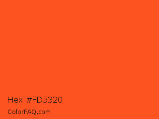 Hex #fd5320 Color is a normal red color and the nearest color is Giants Orange #fe5a1d. Hex code #fd5320 and RGB value is rgb(253,83,32). In RGB color space, this color is composed of 99% red, 33% green, 13% blue, In CMYK color space, this color is composed of 0% cyan, 67% magenta, 87% yellow , 1% black , In HSL color space, this color has a hue angle of 14° , 98% saturation and 56% lightness.