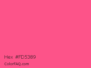 Hex #fd5389 Color is a light rose color and the nearest color is Strawberry #fc5a8d. Hex code #fd5389 and RGB value is rgb(253,83,137). In RGB color space, this color is composed of 99% red, 33% green, 54% blue, In CMYK color space, this color is composed of 0% cyan, 67% magenta, 46% yellow , 1% black , In HSL color space, this color has a hue angle of 341° , 98% saturation and 66% lightness.