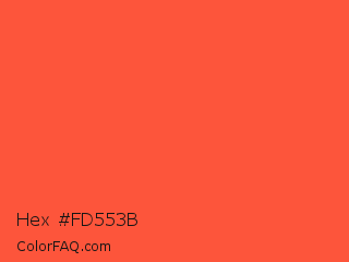 Hex #fd553b Color is a light red color and the nearest color is Ogre Odor #fd5240. Hex code #fd553b and RGB value is rgb(253,85,59). In RGB color space, this color is composed of 99% red, 33% green, 23% blue, In CMYK color space, this color is composed of 0% cyan, 66% magenta, 77% yellow , 1% black , In HSL color space, this color has a hue angle of 8° , 98% saturation and 61% lightness.