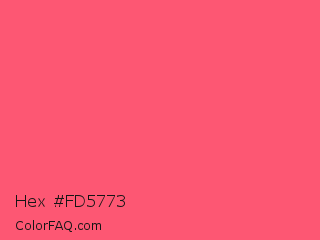 Hex #fd5773 Color is a light red color and the nearest color is Fiery Rose #ff5470. Hex code #fd5773 and RGB value is rgb(253,87,115). In RGB color space, this color is composed of 99% red, 34% green, 45% blue, In CMYK color space, this color is composed of 0% cyan, 66% magenta, 55% yellow , 1% black , In HSL color space, this color has a hue angle of 350° , 98% saturation and 67% lightness.