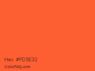 Hex #fd5e32 Color is a normal red color and the nearest color is Outrageous Orange Crayola #ff6037. Hex code #fd5e32 and RGB value is rgb(253,94,50). In RGB color space, this color is composed of 99% red, 37% green, 20% blue, In CMYK color space, this color is composed of 0% cyan, 63% magenta, 80% yellow , 1% black , In HSL color space, this color has a hue angle of 13° , 98% saturation and 59% lightness.