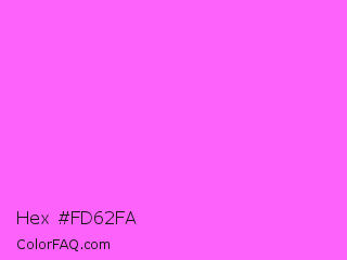 Hex #fd62fa Color is a light magenta color and the nearest color is Pink Flamingo Crayola #ff66ff. Hex code #fd62fa and RGB value is rgb(253,98,250). In RGB color space, this color is composed of 99% red, 38% green, 98% blue, In CMYK color space, this color is composed of 0% cyan, 61% magenta, 1% yellow , 1% black , In HSL color space, this color has a hue angle of 301° , 97% saturation and 69% lightness.