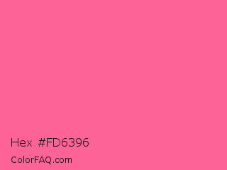 Hex #fd6396 Color is a light rose color and the nearest color is Light Crimson #f56991. Hex code #fd6396 and RGB value is rgb(253,99,150). In RGB color space, this color is composed of 99% red, 39% green, 59% blue, In CMYK color space, this color is composed of 0% cyan, 61% magenta, 41% yellow , 1% black , In HSL color space, this color has a hue angle of 340° , 97% saturation and 69% lightness.