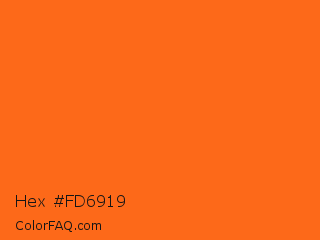 Hex #fd6919 Color is a normal orange color and the nearest color is Orange #ff681f. Hex code #fd6919 and RGB value is rgb(253,105,25). In RGB color space, this color is composed of 99% red, 41% green, 10% blue, In CMYK color space, this color is composed of 0% cyan, 58% magenta, 90% yellow , 1% black , In HSL color space, this color has a hue angle of 21° , 98% saturation and 55% lightness.