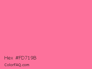 Hex #fd719b Color is a light rose color and the nearest color is French Pink #fd6c9e. Hex code #fd719b and RGB value is rgb(253,113,155). In RGB color space, this color is composed of 99% red, 44% green, 61% blue, In CMYK color space, this color is composed of 0% cyan, 55% magenta, 39% yellow , 1% black , In HSL color space, this color has a hue angle of 342° , 97% saturation and 72% lightness.