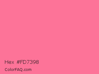 Hex #fd7398 Color is a light rose color and the nearest color is French Pink #fd6c9e. Hex code #fd7398 and RGB value is rgb(253,115,152). In RGB color space, this color is composed of 99% red, 45% green, 60% blue, In CMYK color space, this color is composed of 0% cyan, 55% magenta, 40% yellow , 1% black , In HSL color space, this color has a hue angle of 344° , 97% saturation and 72% lightness.