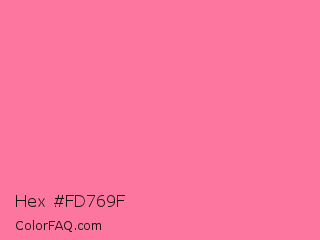 Hex #fd769f Color is a light rose color and the nearest color is French Pink #fd6c9e. Hex code #fd769f and RGB value is rgb(253,118,159). In RGB color space, this color is composed of 99% red, 46% green, 62% blue, In CMYK color space, this color is composed of 0% cyan, 53% magenta, 37% yellow , 1% black , In HSL color space, this color has a hue angle of 342° , 97% saturation and 73% lightness.