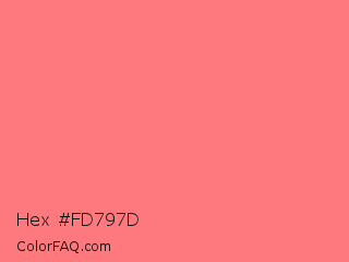 Hex #fd797d Color is a light red color and the nearest color is Froly #f57584. Hex code #fd797d and RGB value is rgb(253,121,125). In RGB color space, this color is composed of 99% red, 47% green, 49% blue, In CMYK color space, this color is composed of 0% cyan, 52% magenta, 51% yellow , 1% black , In HSL color space, this color has a hue angle of 358° , 97% saturation and 73% lightness.