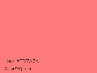 Hex #fd7a7a Color is a light red color and the nearest color is Tea Rose #f88379. Hex code #fd7a7a and RGB value is rgb(253,122,122). In RGB color space, this color is composed of 99% red, 48% green, 48% blue, In CMYK color space, this color is composed of 0% cyan, 52% magenta, 52% yellow , 1% black , In HSL color space, this color has a hue angle of 0° , 97% saturation and 74% lightness.