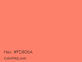 Hex #fd806a Color is a light red color and the nearest color is Coral Reef Hipster Salmon #fd7c6e. Hex code #fd806a and RGB value is rgb(253,128,106). In RGB color space, this color is composed of 99% red, 50% green, 42% blue, In CMYK color space, this color is composed of 0% cyan, 49% magenta, 58% yellow , 1% black , In HSL color space, this color has a hue angle of 9° , 97% saturation and 70% lightness.