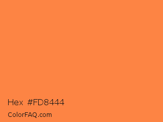 Hex #fd8444 Color is a light orange color and the nearest color is Mango Tango #ff8243. Hex code #fd8444 and RGB value is rgb(253,132,68). In RGB color space, this color is composed of 99% red, 52% green, 27% blue, In CMYK color space, this color is composed of 0% cyan, 48% magenta, 73% yellow , 1% black , In HSL color space, this color has a hue angle of 21° , 98% saturation and 63% lightness.