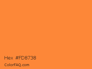 Hex #fd8738 Color is a light orange color and the nearest color is Mango Tango #ff8243. Hex code #fd8738 and RGB value is rgb(253,135,56). In RGB color space, this color is composed of 99% red, 53% green, 22% blue, In CMYK color space, this color is composed of 0% cyan, 47% magenta, 78% yellow , 1% black , In HSL color space, this color has a hue angle of 24° , 98% saturation and 61% lightness.