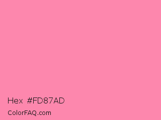 Hex #fd87ad Color is a light rose color and the nearest color is Tickle Me Pink #fc89ac. Hex code #fd87ad and RGB value is rgb(253,135,173). In RGB color space, this color is composed of 99% red, 53% green, 68% blue, In CMYK color space, this color is composed of 0% cyan, 47% magenta, 32% yellow , 1% black , In HSL color space, this color has a hue angle of 341° , 97% saturation and 76% lightness.