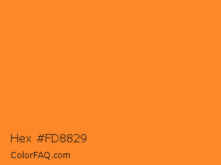 Hex #fd8829 Color is a normal orange color and the nearest color is Princeton Orange #f58025. Hex code #fd8829 and RGB value is rgb(253,136,41). In RGB color space, this color is composed of 99% red, 53% green, 16% blue, In CMYK color space, this color is composed of 0% cyan, 46% magenta, 84% yellow , 1% black , In HSL color space, this color has a hue angle of 27° , 98% saturation and 58% lightness.