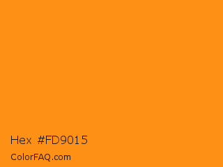 Hex #fd9015 Color is a normal orange color and the nearest color is West Side #ff910f. Hex code #fd9015 and RGB value is rgb(253,144,21). In RGB color space, this color is composed of 99% red, 56% green, 8% blue, In CMYK color space, this color is composed of 0% cyan, 43% magenta, 92% yellow , 1% black , In HSL color space, this color has a hue angle of 32° , 98% saturation and 54% lightness.
