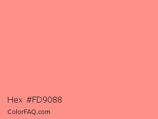 Hex #fd9088 Color is a light red color and the nearest color is Geraldine #fb8989. Hex code #fd9088 and RGB value is rgb(253,144,136). In RGB color space, this color is composed of 99% red, 56% green, 53% blue, In CMYK color space, this color is composed of 0% cyan, 43% magenta, 46% yellow , 1% black , In HSL color space, this color has a hue angle of 4° , 97% saturation and 76% lightness.