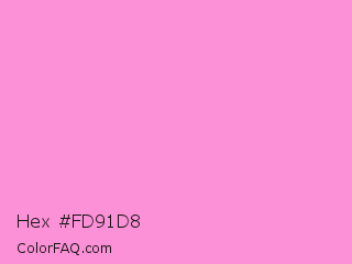 Hex #fd91d8 Color is a light magenta color and the nearest color is Pale Magenta Pink #ff99cc. Hex code #fd91d8 and RGB value is rgb(253,145,216). In RGB color space, this color is composed of 99% red, 57% green, 85% blue, In CMYK color space, this color is composed of 0% cyan, 43% magenta, 15% yellow , 1% black , In HSL color space, this color has a hue angle of 321° , 96% saturation and 78% lightness.