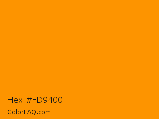Hex #fd9400 Color is a normal orange color and the nearest color is Pizazz #ff9000. Hex code #fd9400 and RGB value is rgb(253,148,0). In RGB color space, this color is composed of 99% red, 58% green, 0% blue, In CMYK color space, this color is composed of 0% cyan, 42% magenta, 100% yellow , 1% black , In HSL color space, this color has a hue angle of 35° , 100% saturation and 50% lightness.