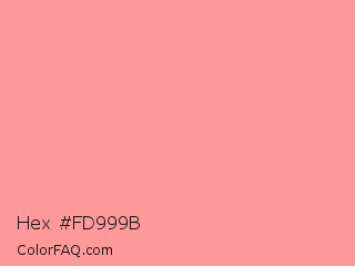 Hex #fd999b Color is a light red color and the nearest color is Light Salmon Pink #ff9999. Hex code #fd999b and RGB value is rgb(253,153,155). In RGB color space, this color is composed of 99% red, 60% green, 61% blue, In CMYK color space, this color is composed of 0% cyan, 40% magenta, 39% yellow , 1% black , In HSL color space, this color has a hue angle of 359° , 96% saturation and 80% lightness.
