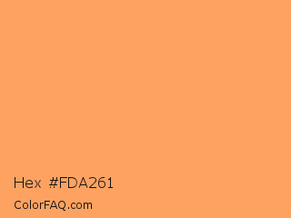 Hex #fda261 Color is a light orange color and the nearest color is Tan Hide #fa9d5a. Hex code #fda261 and RGB value is rgb(253,162,97). In RGB color space, this color is composed of 99% red, 64% green, 38% blue, In CMYK color space, this color is composed of 0% cyan, 36% magenta, 62% yellow , 1% black , In HSL color space, this color has a hue angle of 25° , 98% saturation and 69% lightness.