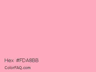 Hex #fda8bb Color is a very light red color and the nearest color is Sundown #ffb1b3. Hex code #fda8bb and RGB value is rgb(253,168,187). In RGB color space, this color is composed of 99% red, 66% green, 73% blue, In CMYK color space, this color is composed of 0% cyan, 34% magenta, 26% yellow , 1% black , In HSL color space, this color has a hue angle of 347° , 96% saturation and 83% lightness.